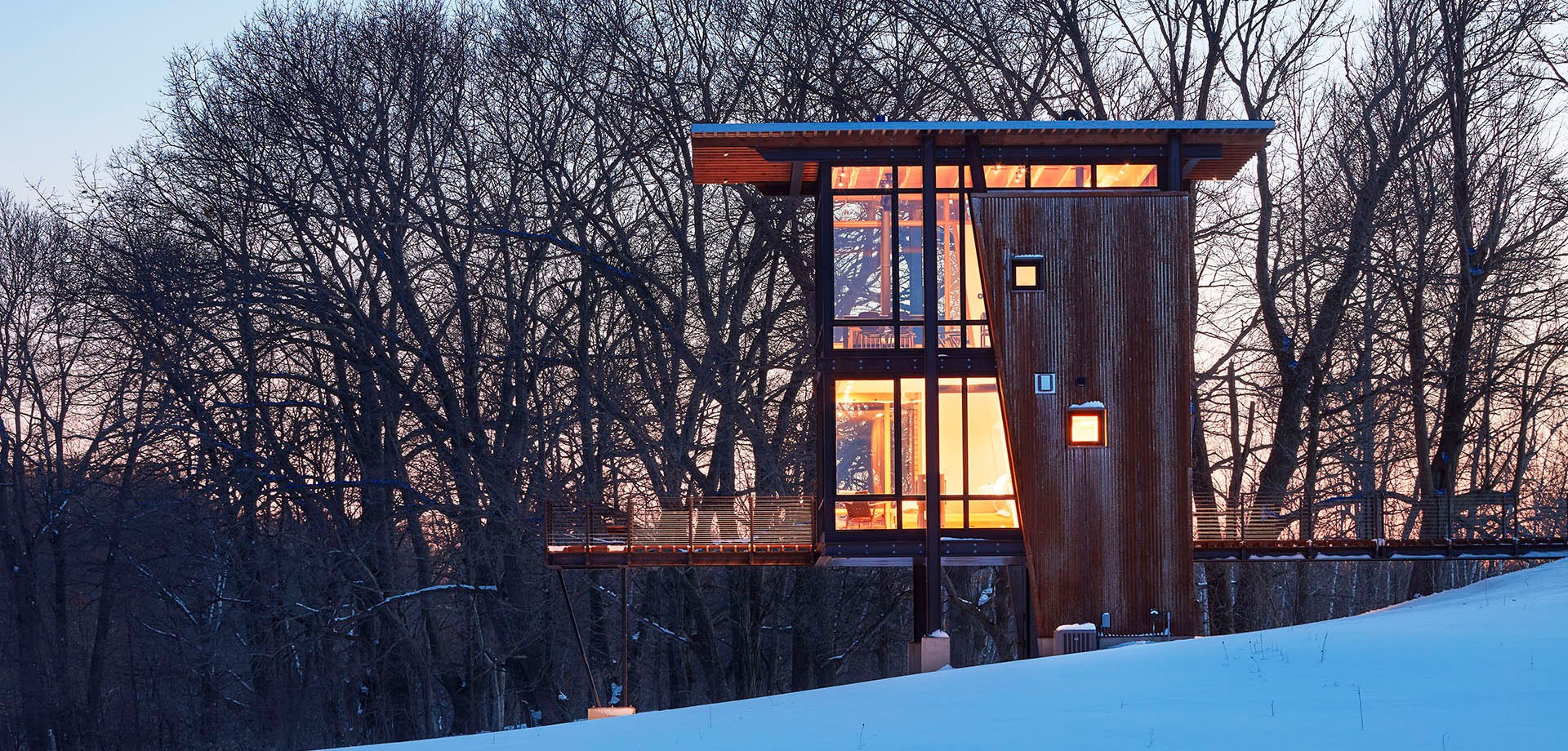 The tower’s siding is corteen steel designed to last through the harsh Wisconsin winters, over time it has developed a patina and a rustic rusty appearance. It plays a dual purpose, also acting as a steel ‘overcoat’ to protect guests in the tower from bitter winter winds.