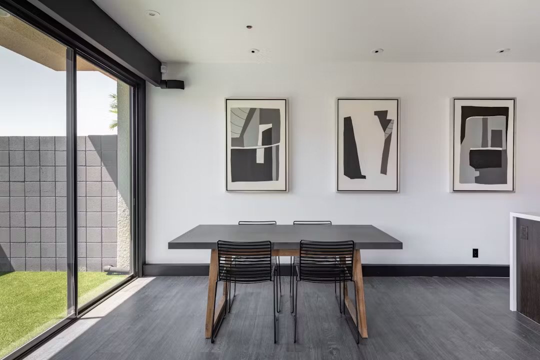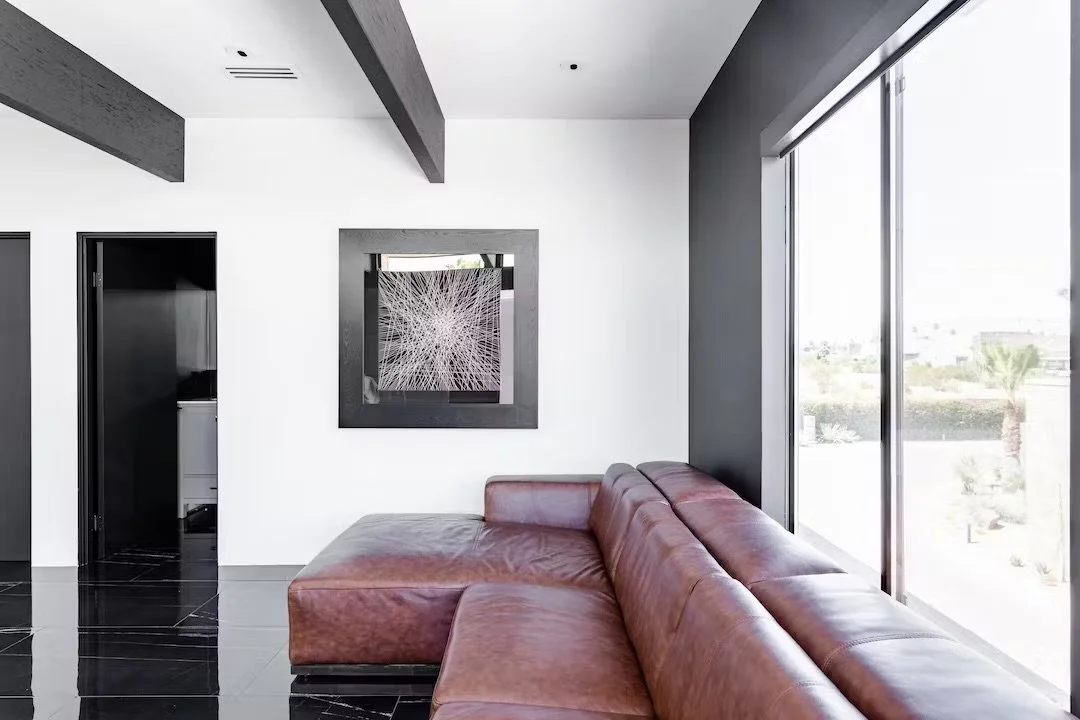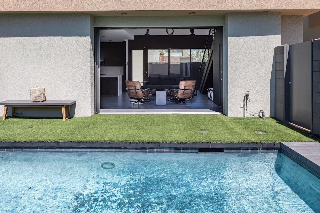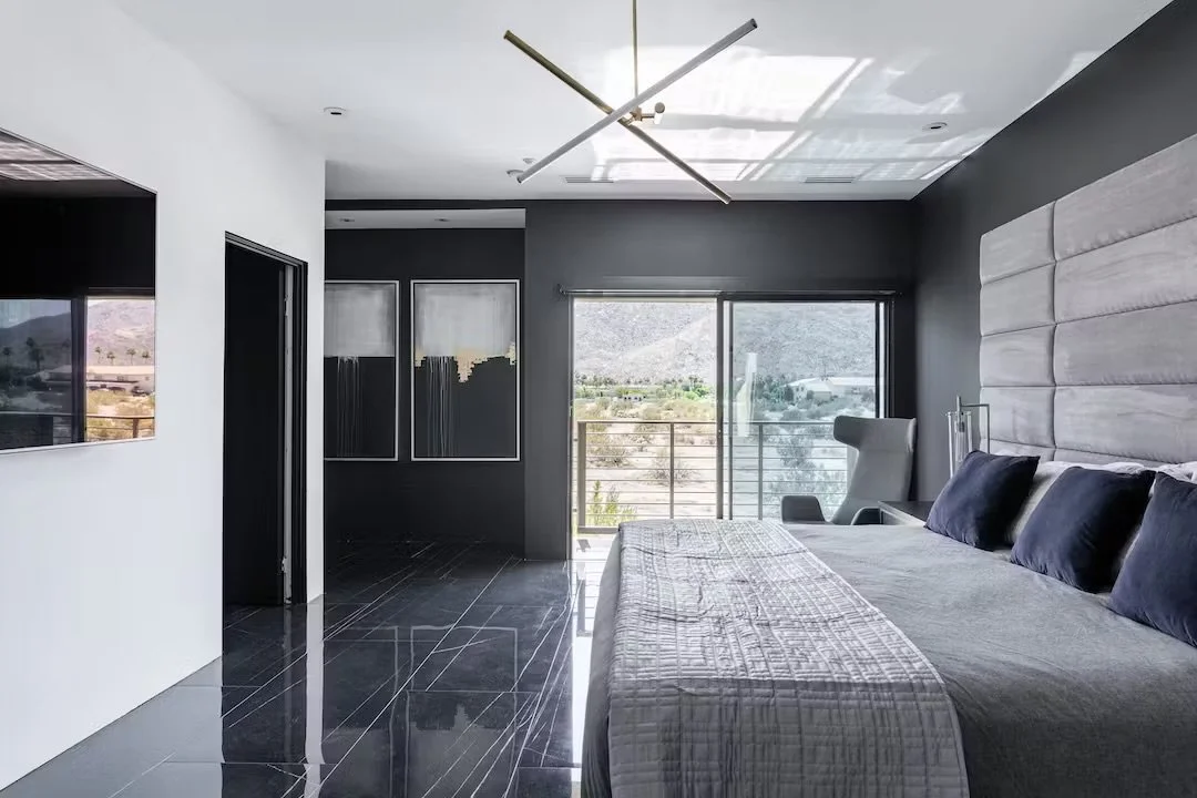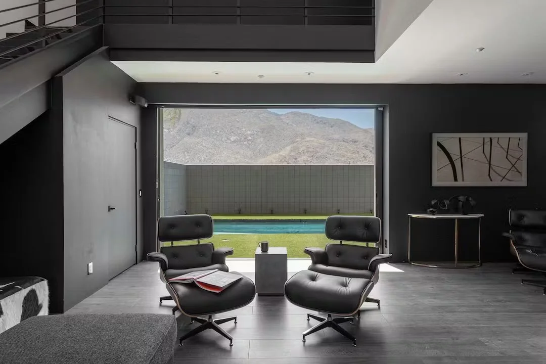Monochromatic and masculine, Neo-Noir is a unique contemporary minimalism stay. Inside, it’s a mix of sleek surfaces, modern finishes with matte-black metal and polished black marble, and the occasional mid-century modern touch. Enjoy unobstructed mountain views from the living room, kitchen, master bedroom, and the backyard.