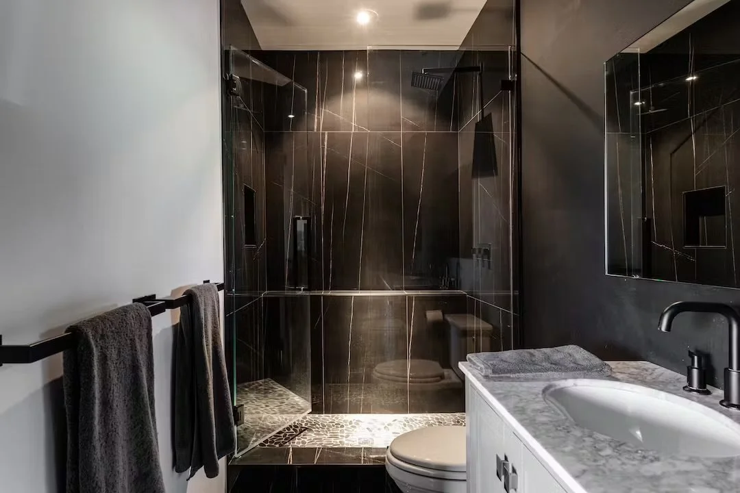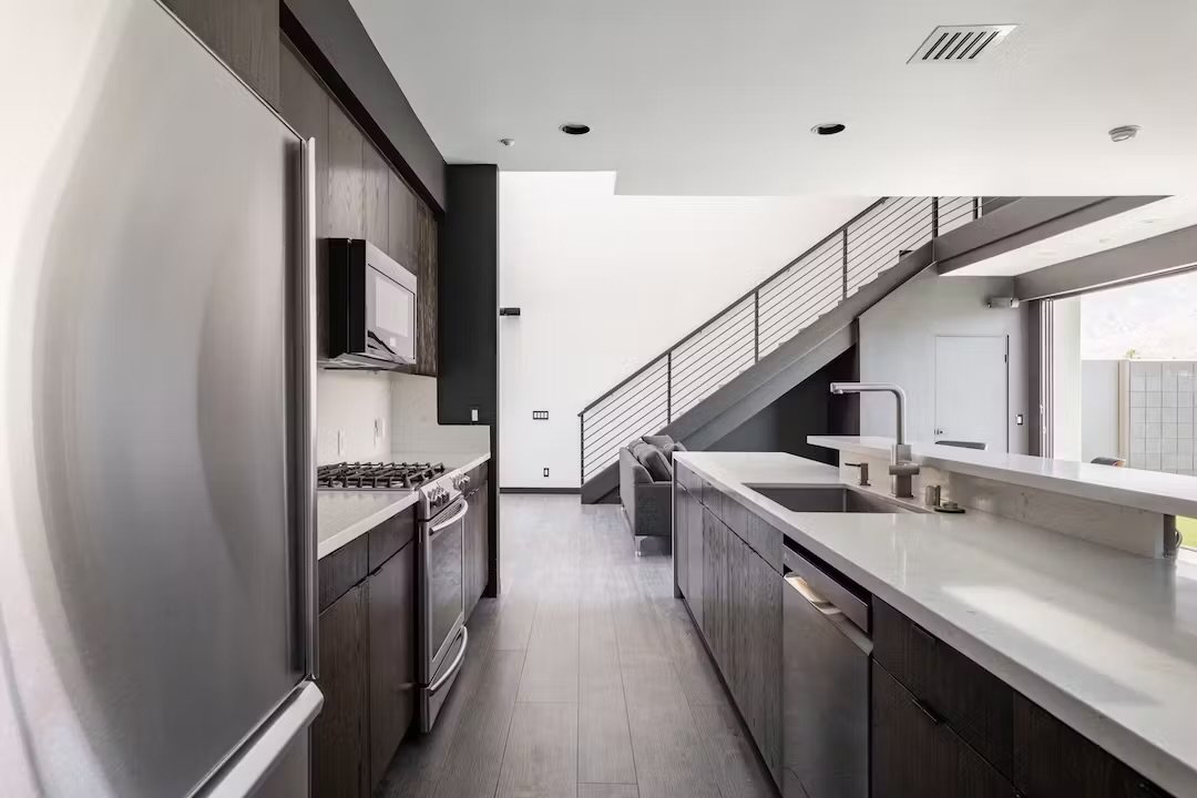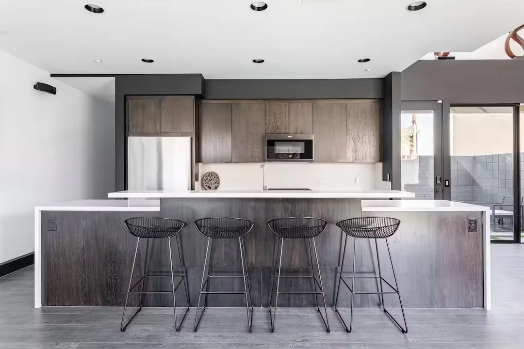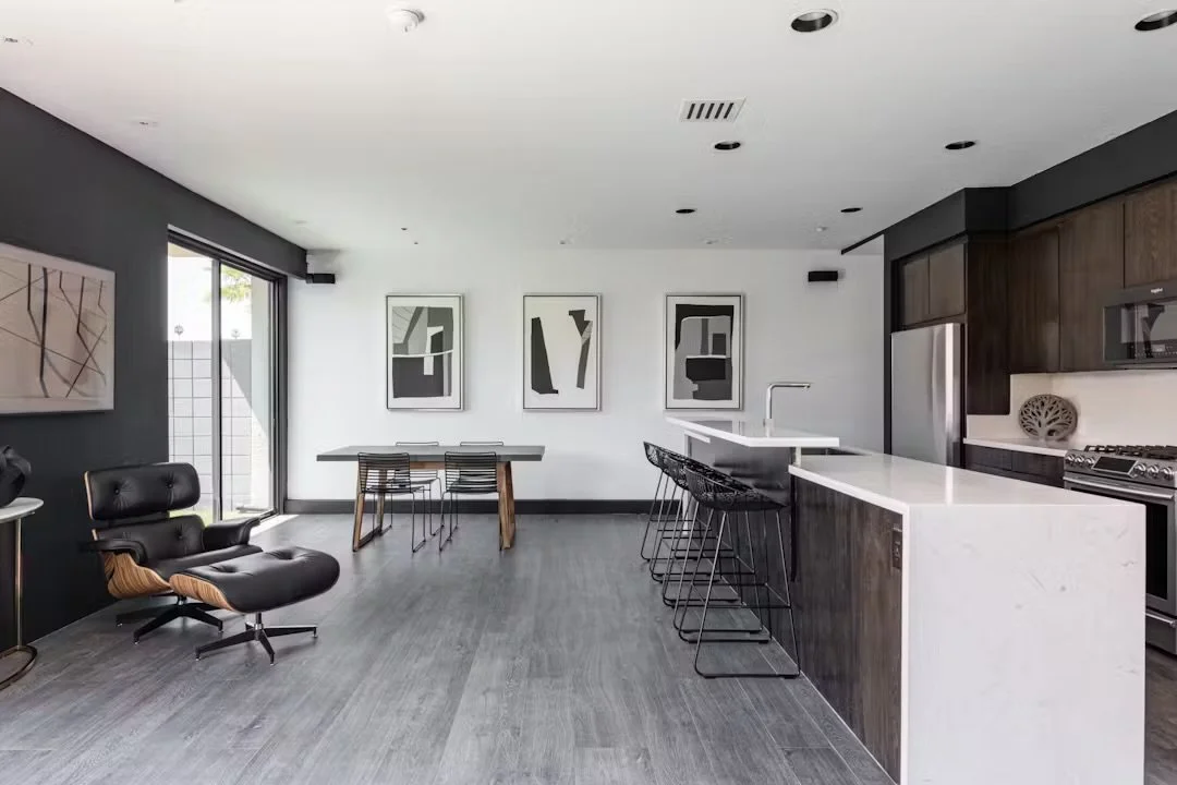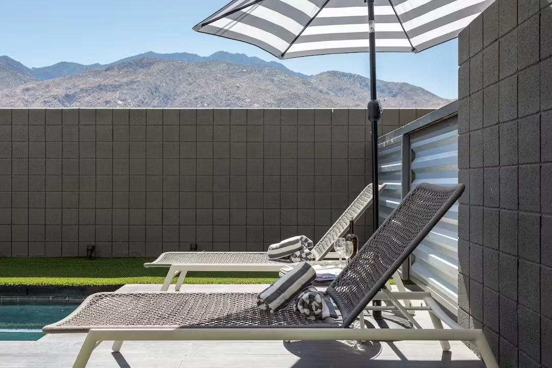 Monochromatic and masculine, Neo-Noir is a unique contemporary minimalism stay. Inside, it’s a mix of sleek surfaces, modern finishes with matte-black metal and polished black marble, and the occasional mid-century modern touch. Enjoy unobstructed mountain views from the living room, kitchen, master bedroom, and the backyard.