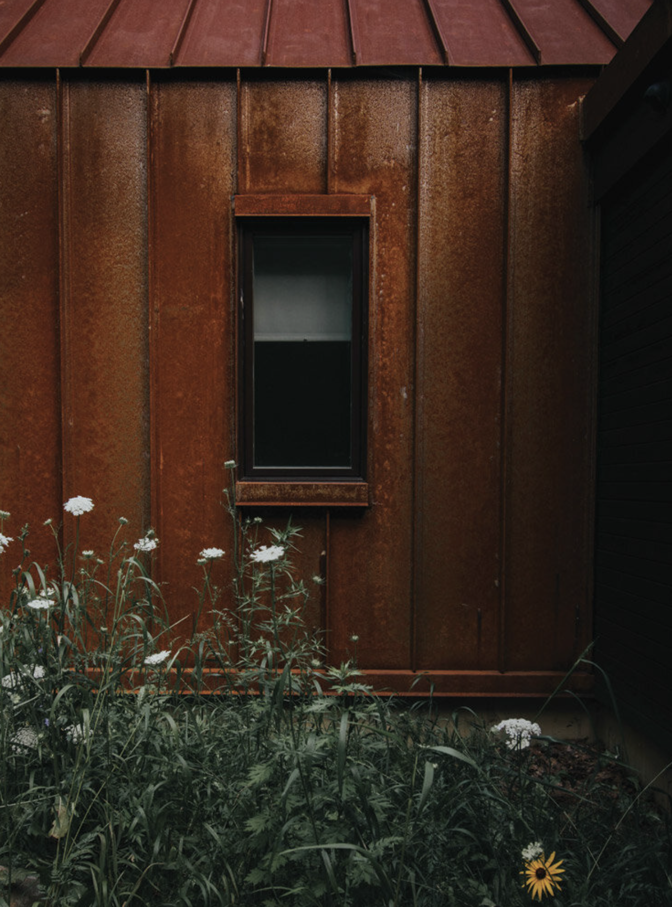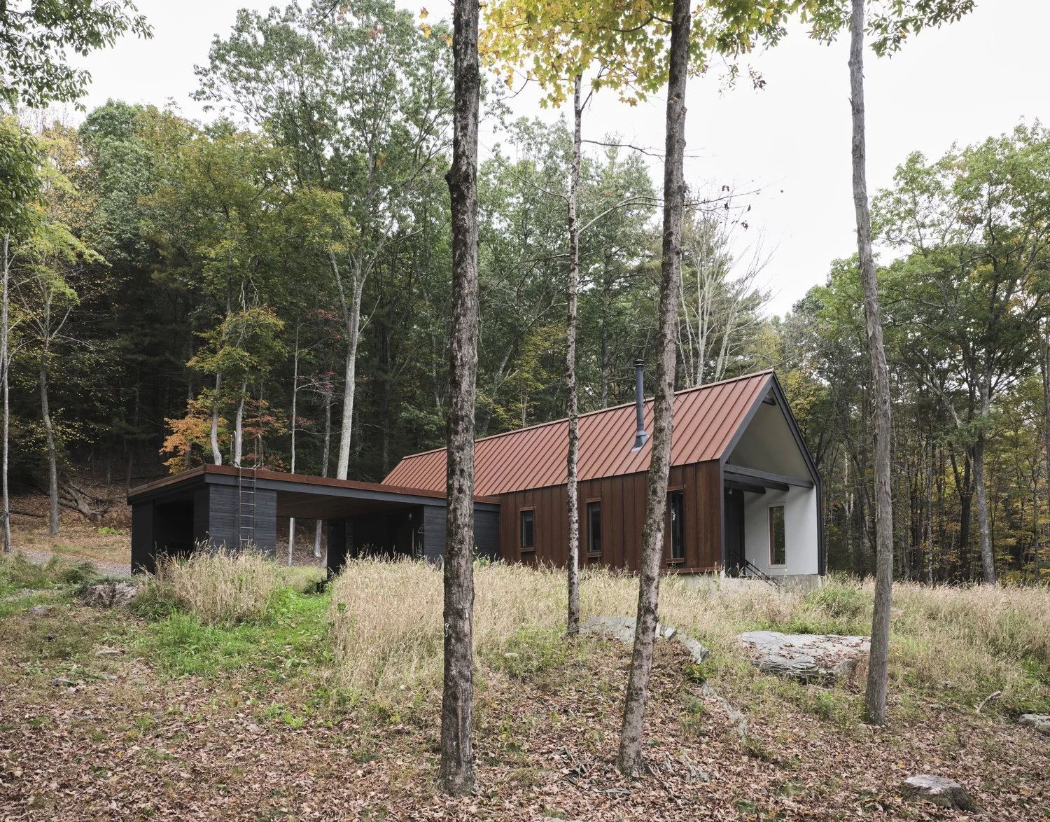 The Pond House uses a simple gable form oriented to face south and overlook the pond. It has a a flat roof extension to shield the entry and cover the connected outdoor space. The exterior is rusted standing seam Corten with blackened cedar at the exposed gable ends.