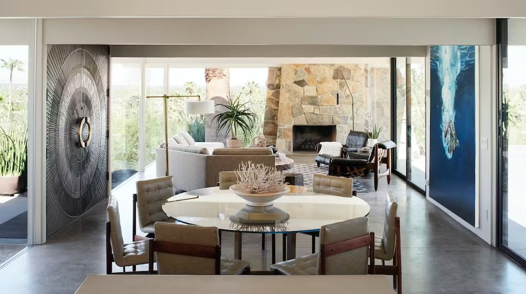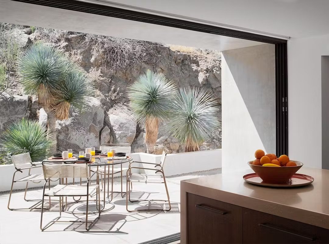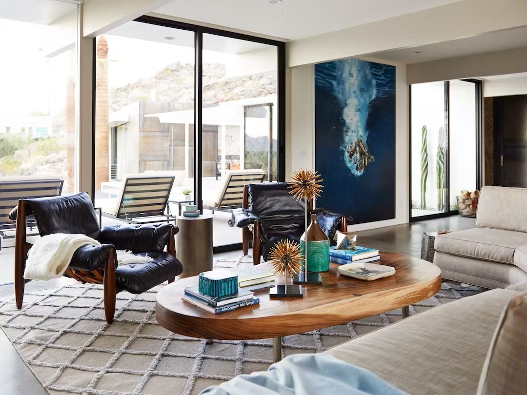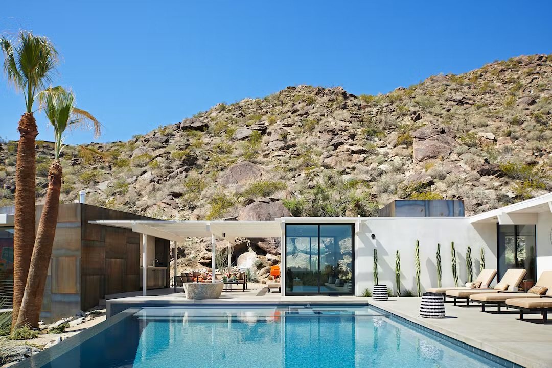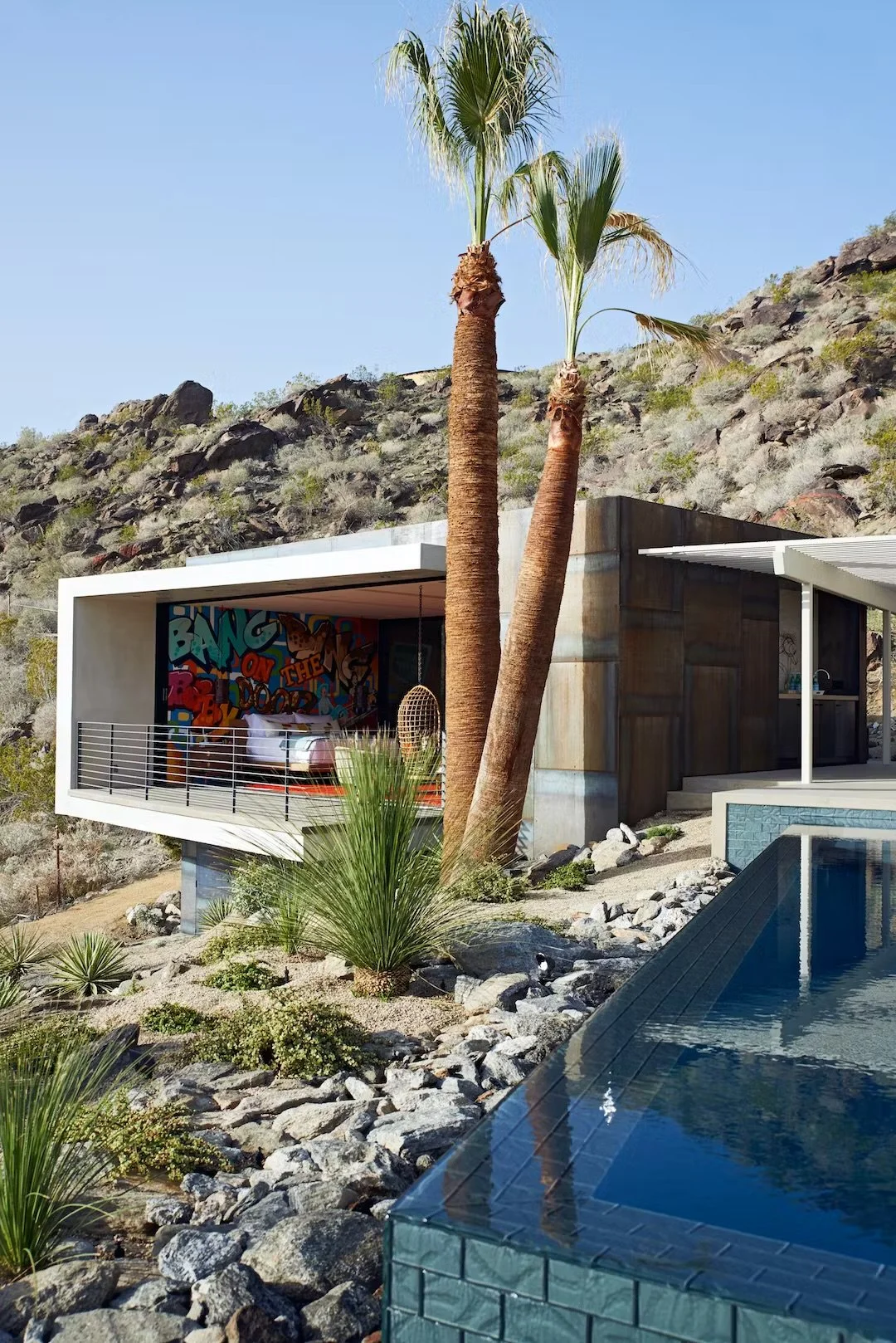 Upscale interior design means rooms brim with period-inspired furnishings, contemporary takes on mid-century modern lines, and splashy works of art. The elegant pool dominates the sleek home’s heart, its cool infinity edges suspended above the rock-strewn desert valley.