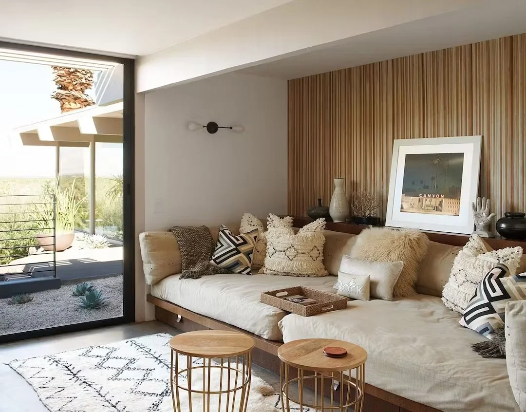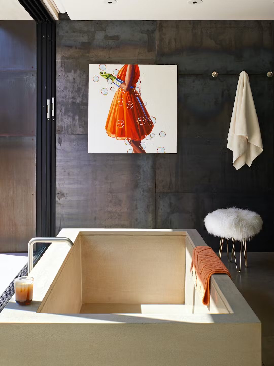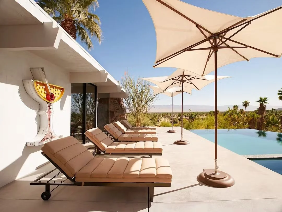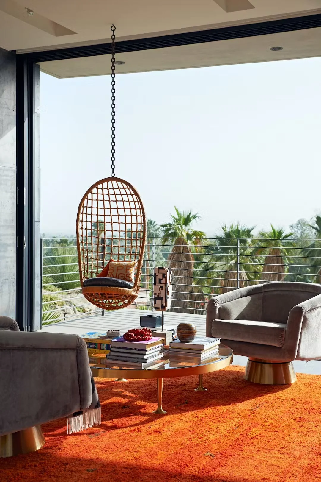 Upscale interior design means rooms brim with period-inspired furnishings, contemporary takes on mid-century modern lines, and splashy works of art. The elegant pool dominates the sleek home’s heart, its cool infinity edges suspended above the rock-strewn desert valley.