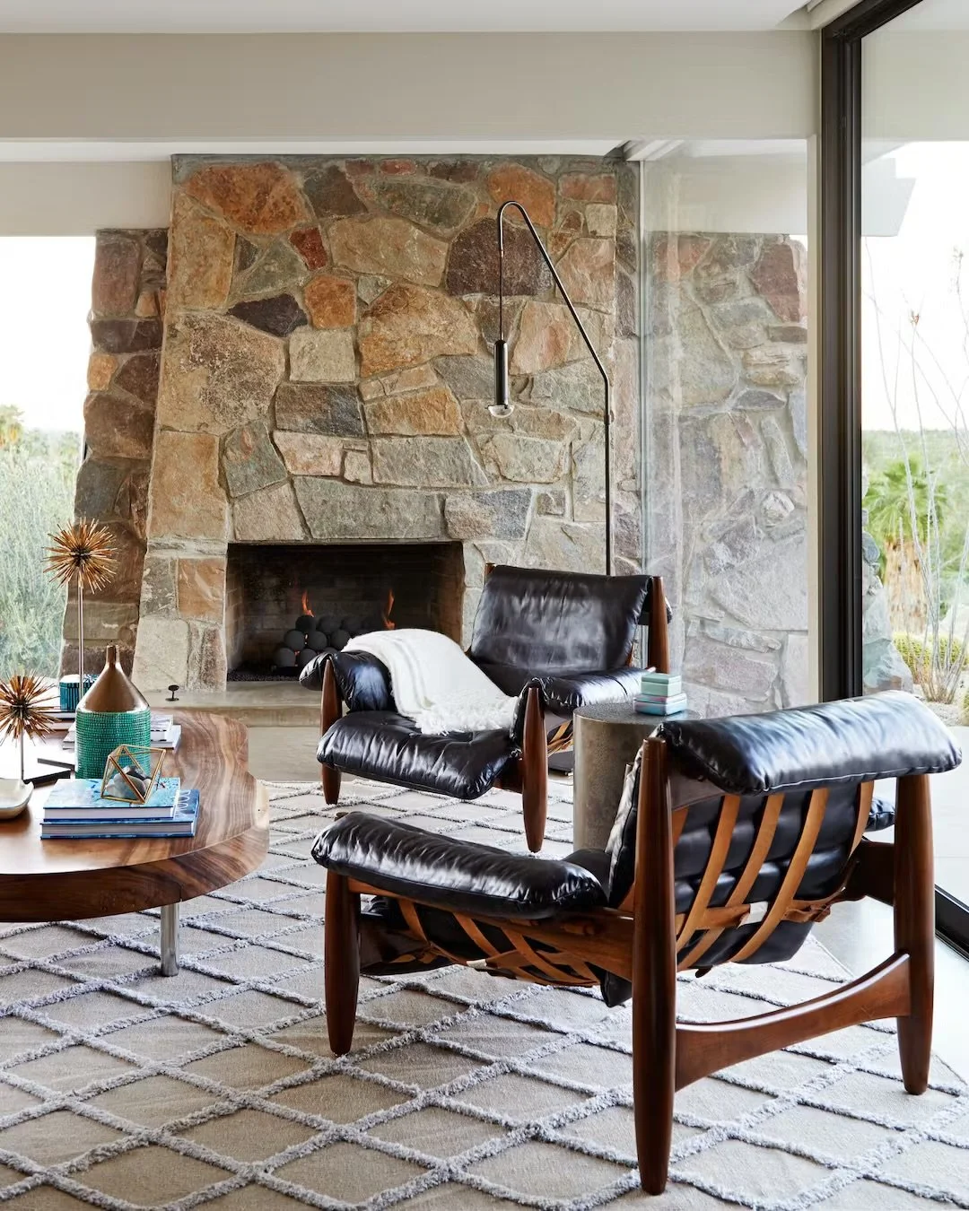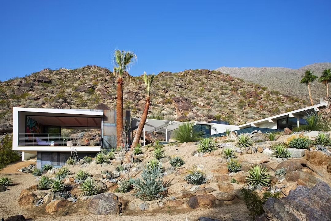 A stirring study of pure Palm Springs Desert Modernism designed by Hugh Kaptur, this sleek villa cuts sharply into its rocky hillside location. A neolithic entry opens impressively into the strikingly transparent living space pinned down by a massive stone hearth. The home’s sharp angles of glass, steel, and stucco seem to glide across the rugged, albeit landscaped, hillside, creating a layout that’s open concept and open to the elements via generous windows and wide sliding doors.
