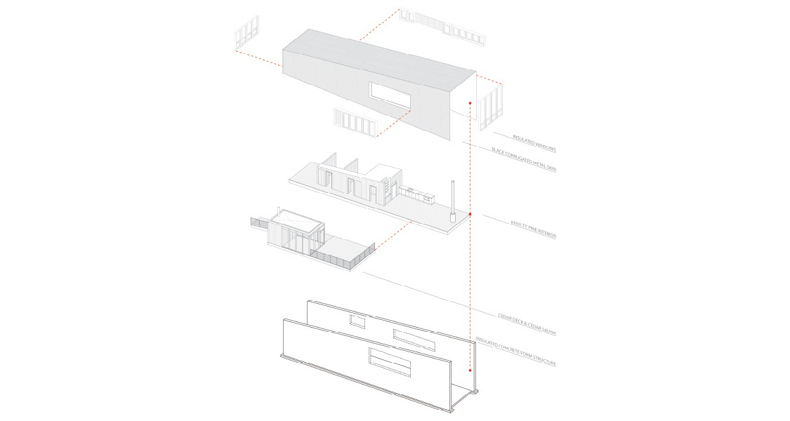 The orientation of the cabin is informed by the Scandinavian precedent of a Stabbur (a place for a bathhouse, grain drying shed, food preparation) - where the main level is raised above the winter snow.